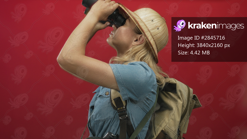 Woman explorer with binoculars and backpack looking up in studio; curiosity exploration adventure travel.
