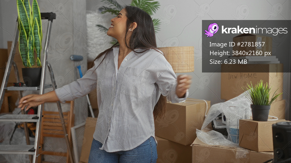 Woman explores new home surrounded by boxes and plants in living room setting suggesting moving day and fresh start indoors.
