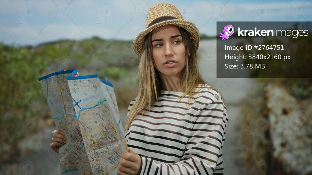 Woman exploring outdoor park holding map in hand with thoughtful expression, dressed casually wearing hat, surrounded by natural scenery on a sunny day. - Kraken Images