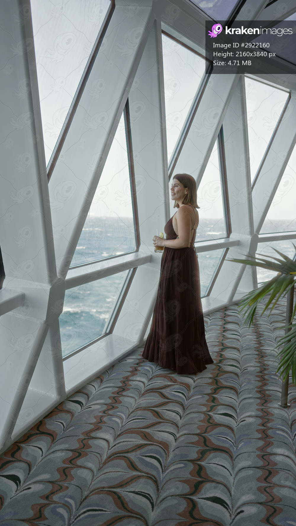Woman with exposed back holding a cocktail and gazing through large windows on a cruise ship deck corridor; serenity.