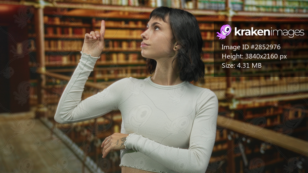 Woman with exposed hand points finger upward to wooden bookshelf railing in a library building; curiosity insight exploration discovery.