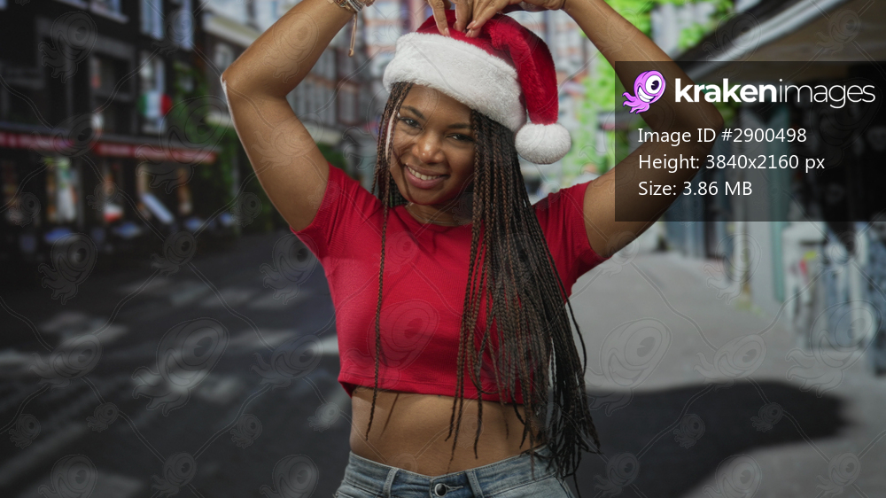 Woman with exposed midriff adjusting santa hat with hands forming a heart above head on street; holiday joy.