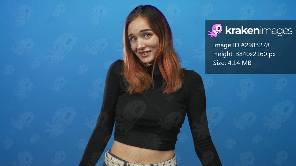 Woman with exposed midriff shrugs shoulders with palms slightly raised in blue studio wearing black crop top and studded belt; uncertainty.