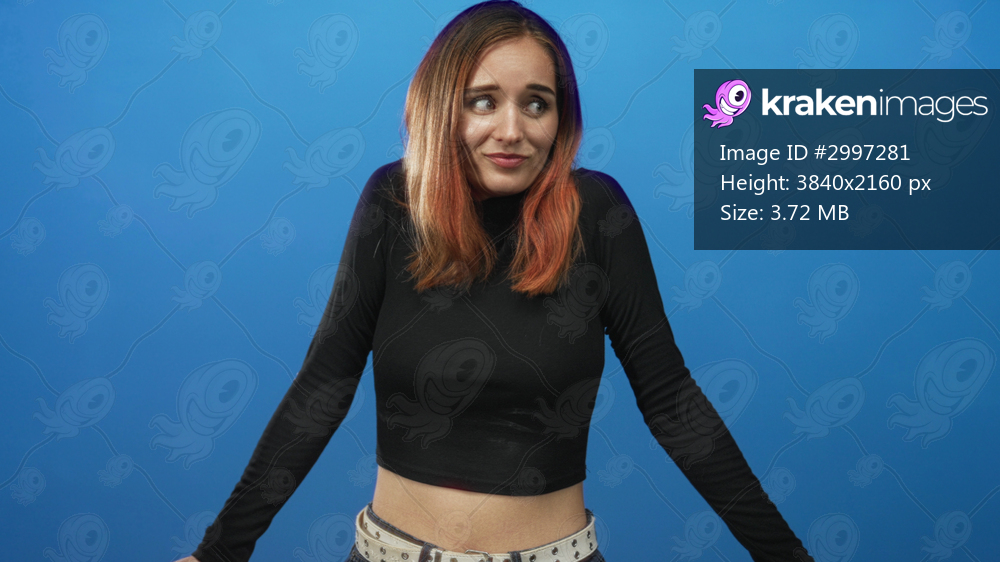 Woman with exposed midriff shrugs shoulders with palms slightly raised in blue studio wearing black crop top and studded belt; uncertainty.