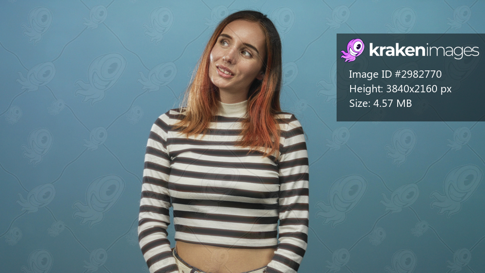 Woman with exposed midriff wearing black and white striped top, tilting head and looking up with a slight smile against blue studio wall; thoughtful.