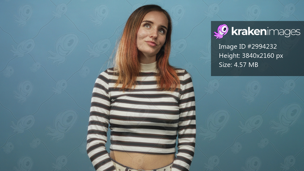 Woman with exposed midriff wearing black and white striped top, tilting head and looking up with a slight smile against blue studio wall; thoughtful.