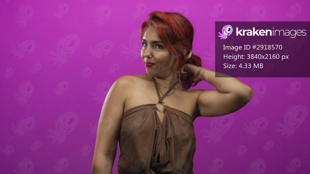 Woman with exposed shoulder and hand touching red ponytail in magenta studio wearing brown strapless top; confidence poise charm.
