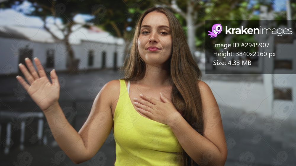 Woman with exposed shoulder wearing yellow tank top standing on a street lined with trees; confidence ease.