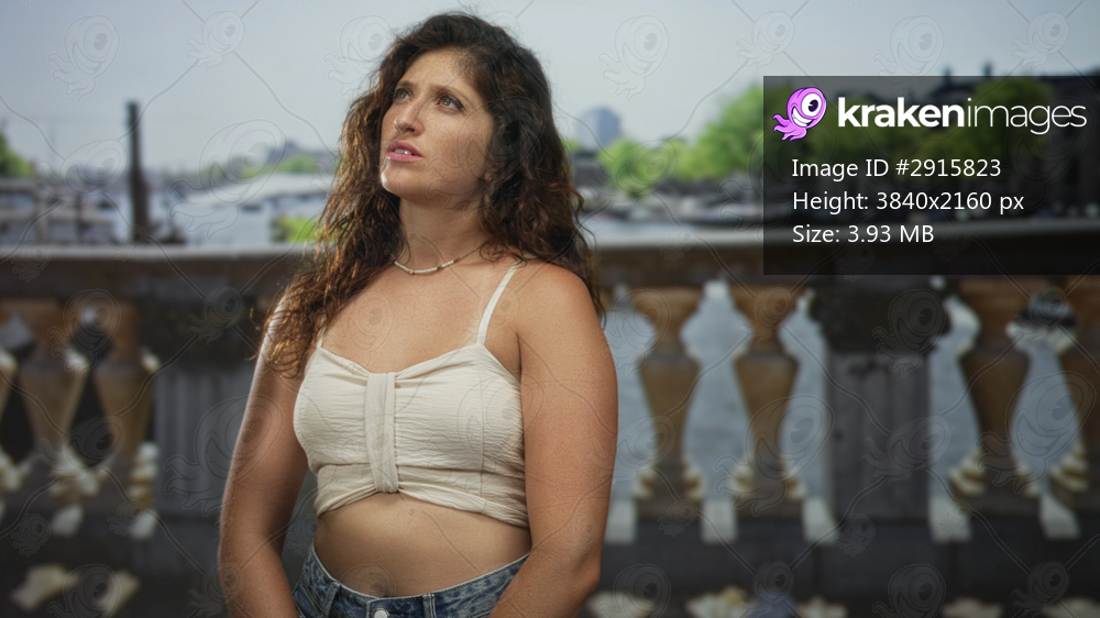 Woman with exposed stomach wearing a cream crop top and jeans gazing up on street by a canal balustrade in amsterdam; quiet contemplation.