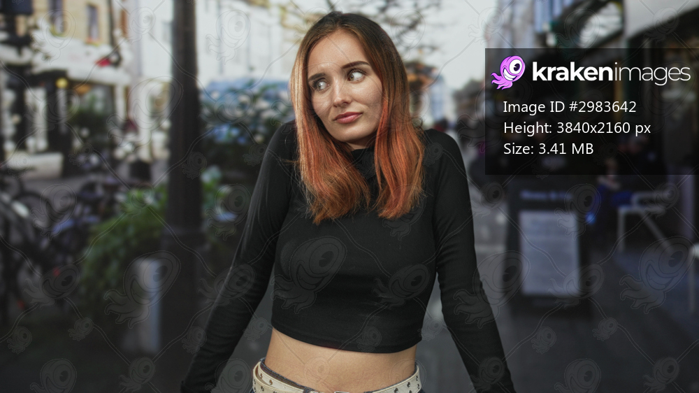 Woman with exposed waist shrugs shoulders on a busy pedestrian street lined with cafes and bicycles, glancing aside with a tentative smile; hesitation. - Kraken Images
