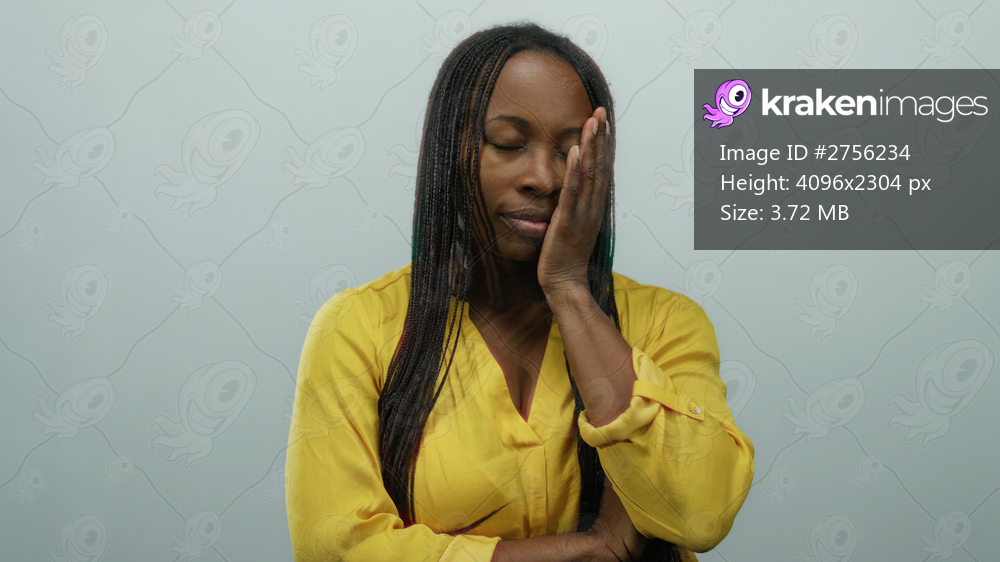 Woman expresses emotion standing with arms folded against a plain white background, wearing a bright yellow shirt, showcasing african descent and calm demeanor. - Kraken Images
