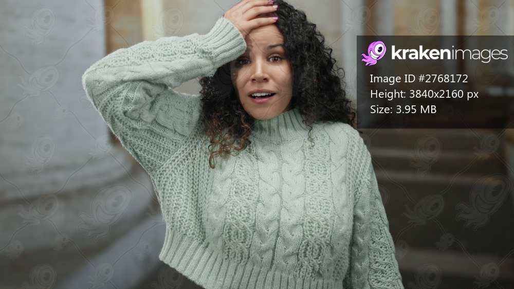 Woman expresses surprise indoors at church, wearing a knit sweater, with hispanic features, illustrating emotion, spirituality, architecture, and personal experience. - Kraken Images