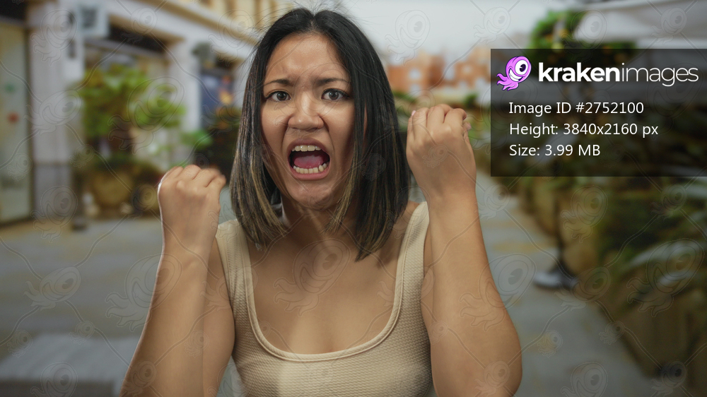 Woman expressing anger with clenched fists in a vibrant city street, surrounded by blurred urban background, conveying frustration, energy, and emotion in a public outdoor setting. - Kraken Images