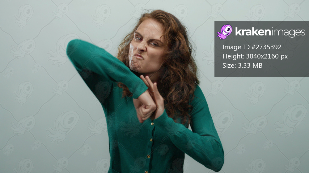 Woman expressing anger gesturing aggressively against white background wearing green sweater with curly hair and caucasian appearance over isolated setting depicting frustration vividly - Kraken Images
