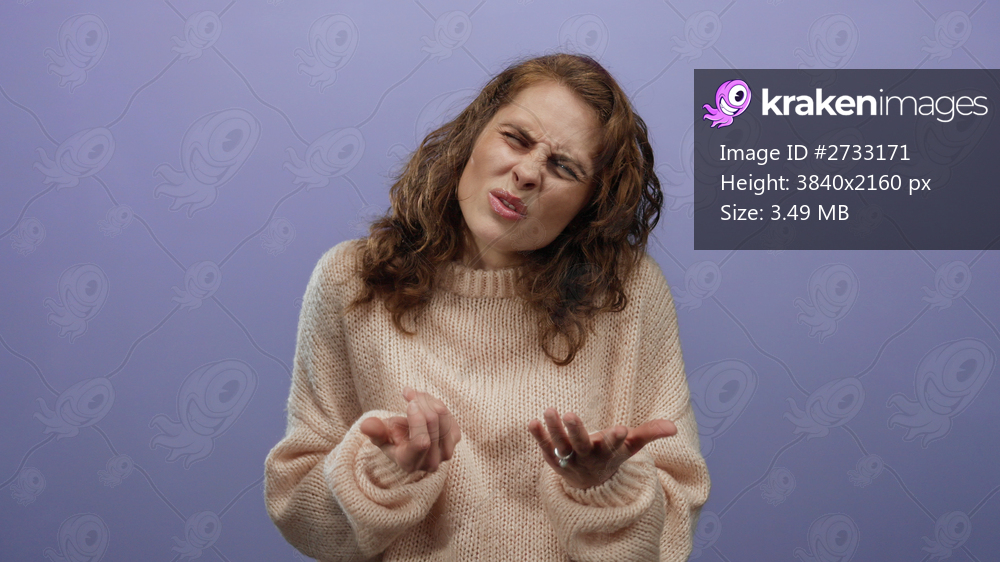 Woman expressing confusion against a purple background, wearing a cozy sweater, gesturing expressively with a perplexed look, isolated for conceptual imagery. - Kraken Images