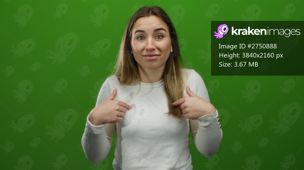 Woman expressing confusion with hand gestures over an isolated green background wearing a white shirt and facial expression of uncertainty and curiosity. - Kraken Images