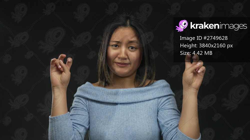 Woman expressing confusion in thoughtful gestures over isolated black background, wearing blue in contemplative mood and unsure expression with hands raised in quote symbol. - Kraken Images