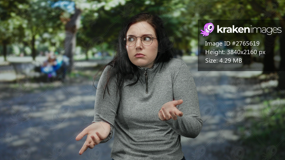 Woman expressing confusion outdoors with arms crossed in a sunny green park setting, wearing glasses and a gray sweater, portraying a thoughtful or puzzled mood. - Kraken Images