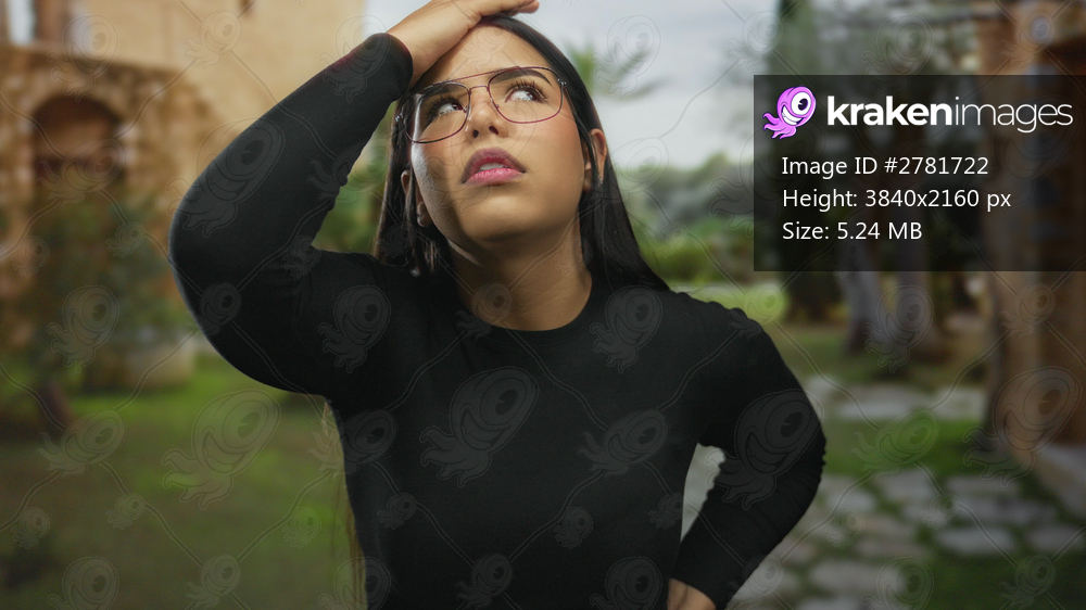 Woman expressing confusion outdoors with glasses surrounded by greenery and rustic architecture.