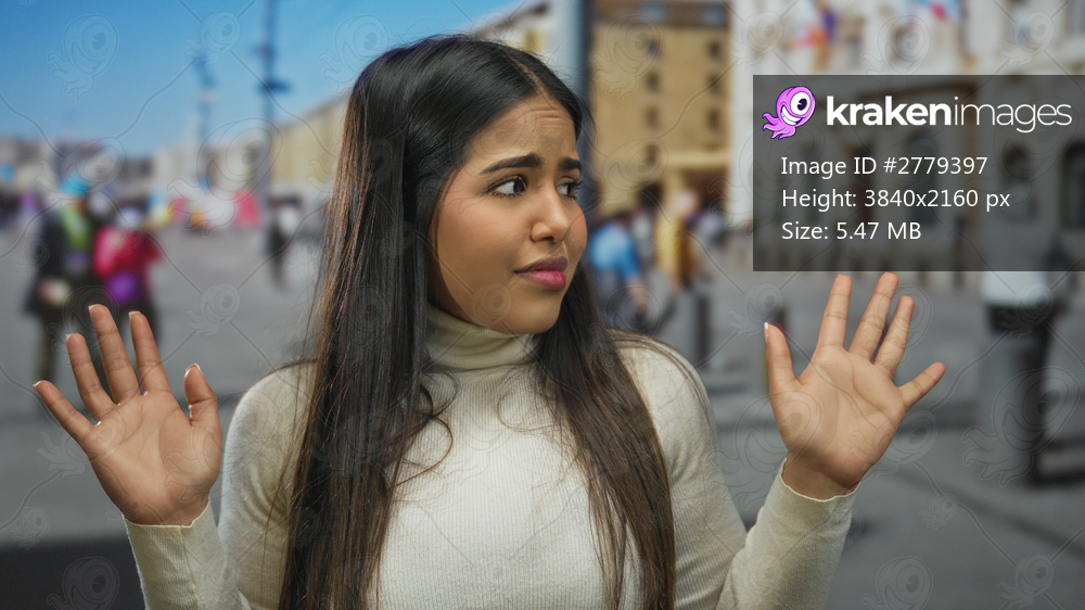 Woman expressing confusion or uncertainty with raised hands on a busy urban street featuring diverse pedestrians and distant buildings.