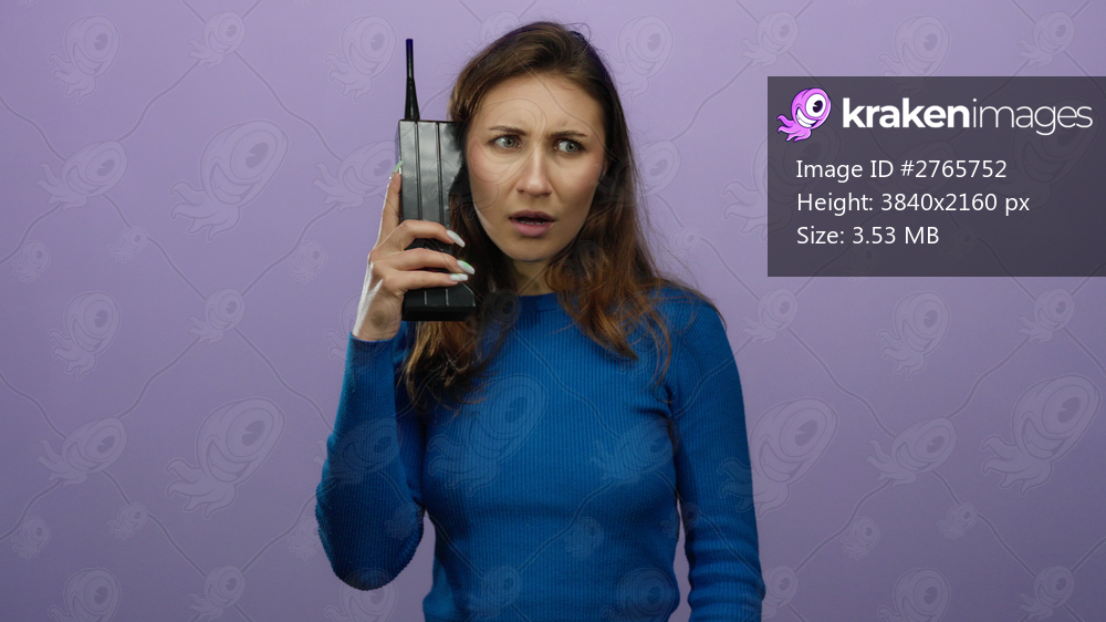 Woman expressing confusion while holding a vintage phone against a purple wall, showcasing emotions and retro style in an isolated setting.