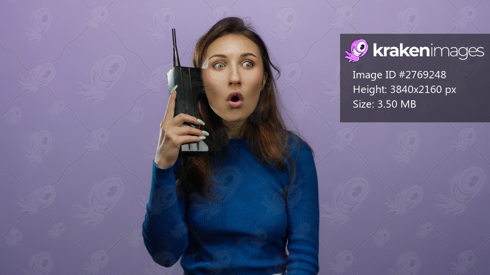 Woman expressing confusion while holding a vintage phone against a purple wall, showcasing emotions and retro style in an isolated setting.