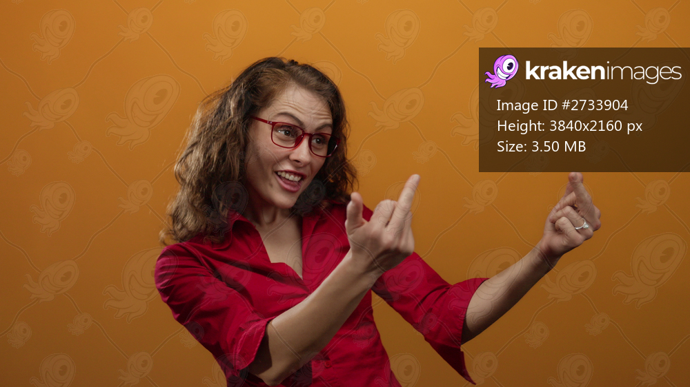 Woman expressing defiance with middle finger gesture against an orange background, wearing red outfit and glasses, showcasing youthful defiant attitude. - Kraken Images
