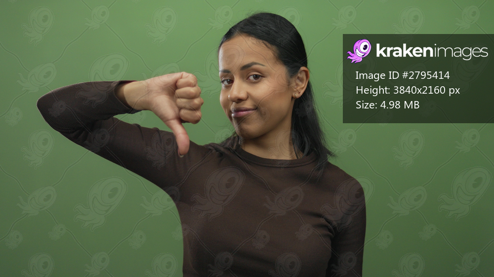 Woman expressing disapproval with a thumbs-down gesture against a green background wall, wearing a brown shirt and having a neutral expression in an isolated setting. - Kraken Images