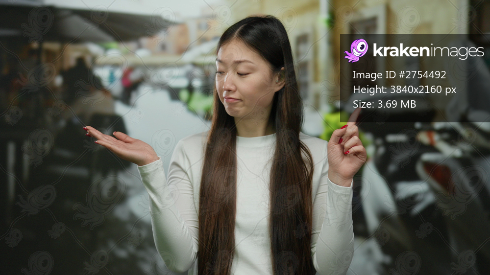 Woman expressing disapproval on a city terrace with open palm, suggesting no in an outdoor urban restaurant setting, showcasing a casual young female presence in town. - Kraken Images