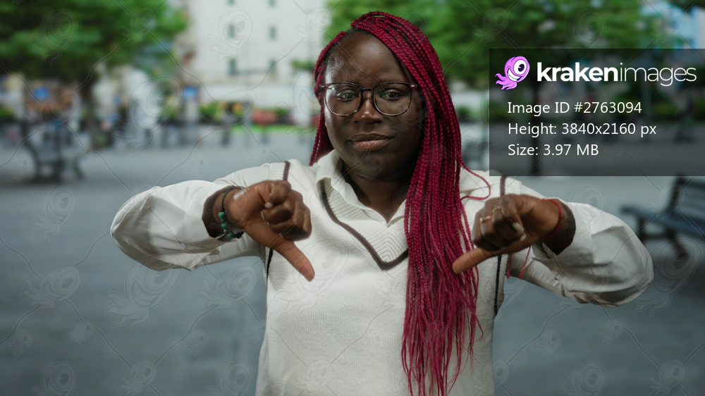 Woman expressing disapproval outdoors on a city street with trees and buildings in the background, showcasing urban life and emotion.