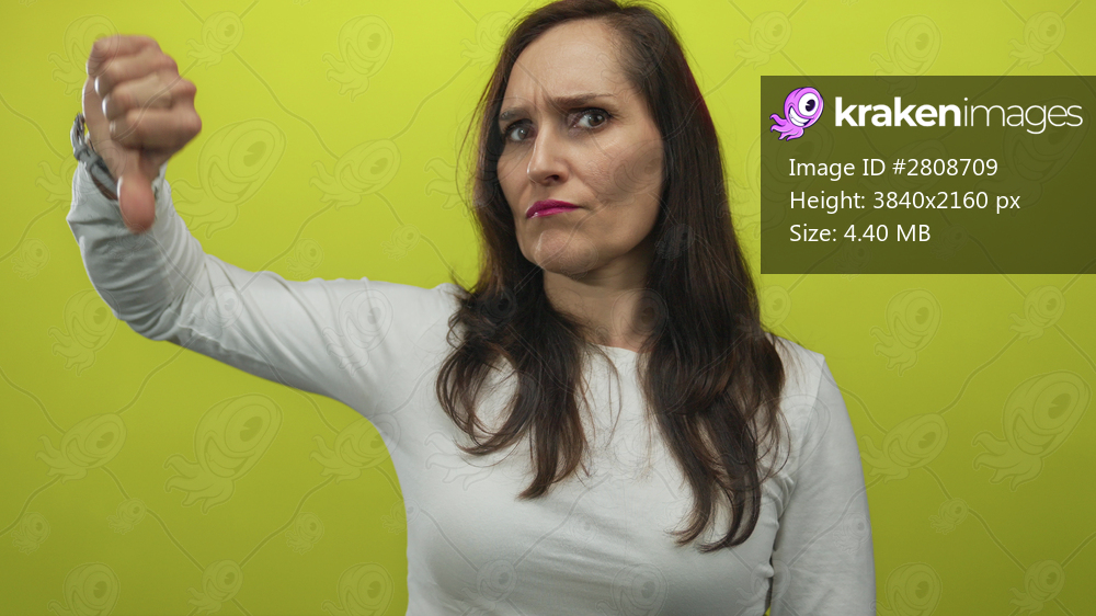 Woman expressing disapproval with thumbs down over bright yellow background.