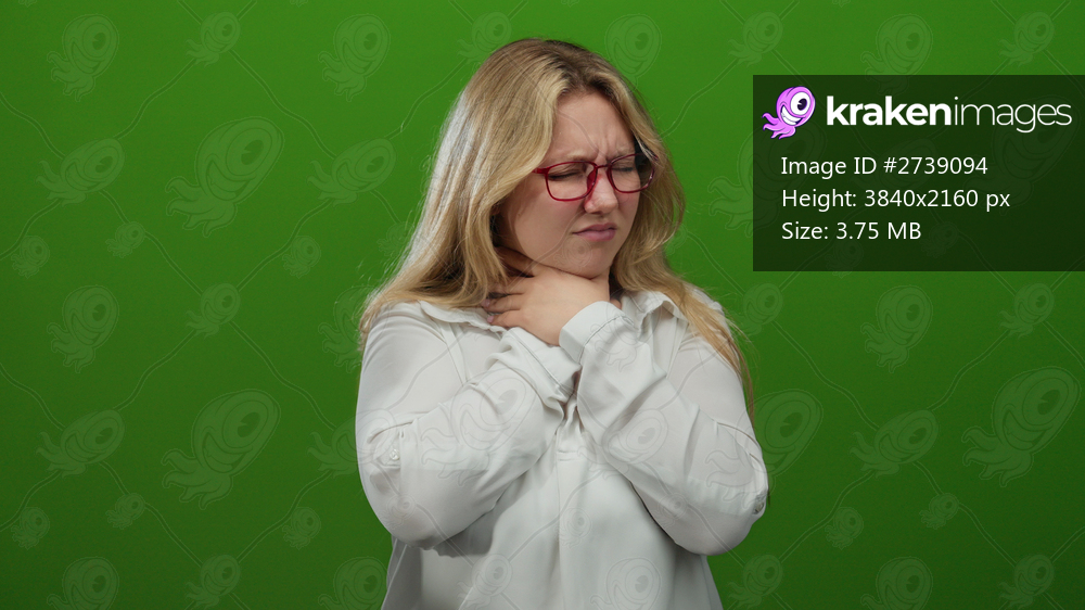 Woman expressing discomfort holding neck over a green background wearing glasses and a white shirt depicting health issue or stress