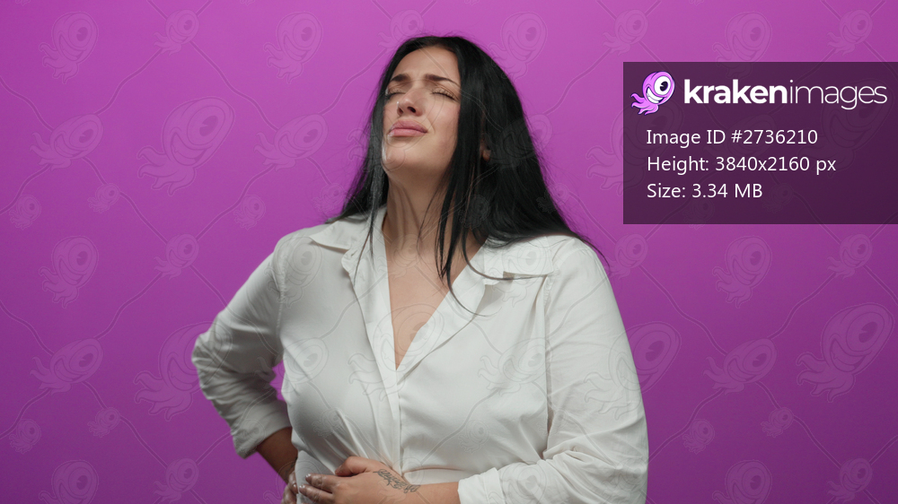 Woman expressing discomfort on pink background wearing white shirt, highlighting emotion, isolation, and elegance.