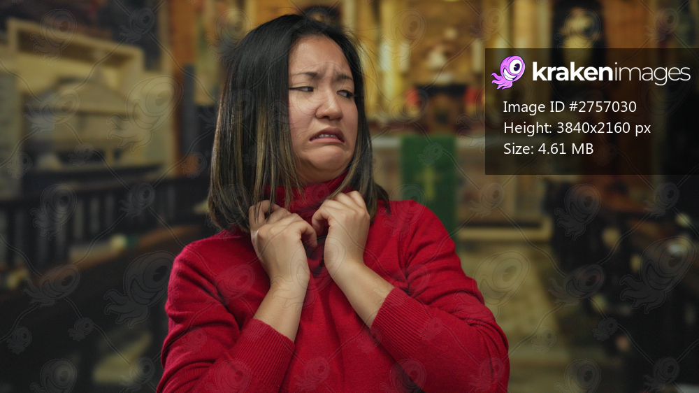Woman expressing disgust in church interior, wearing red sweater, showcasing unexpected emotion within religious setting, blending cultural and emotional contrasts. - Kraken Images