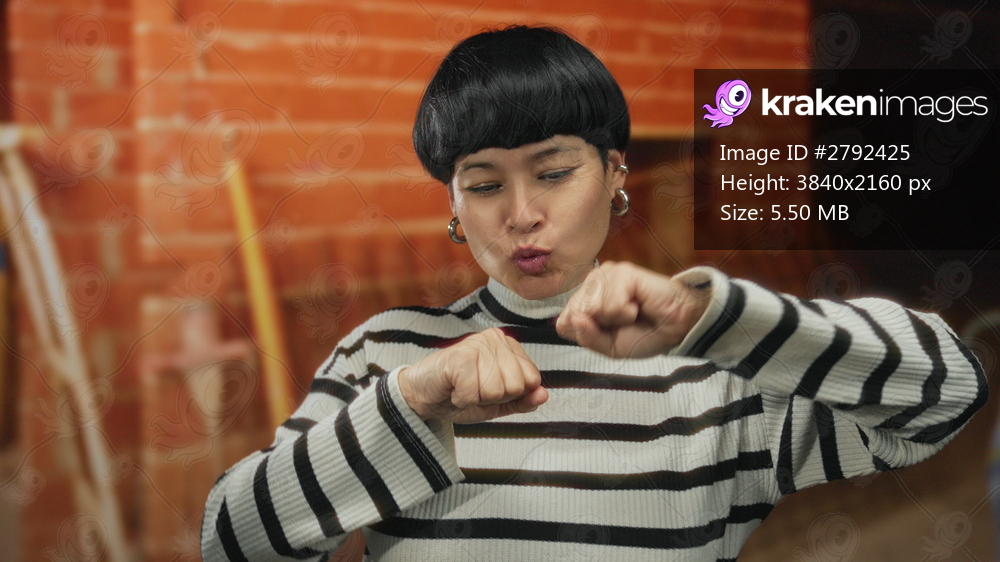 Woman expressing diverse emotions at an indoor construction site with a brick wall backdrop, showcasing casual style and enthusiasm.