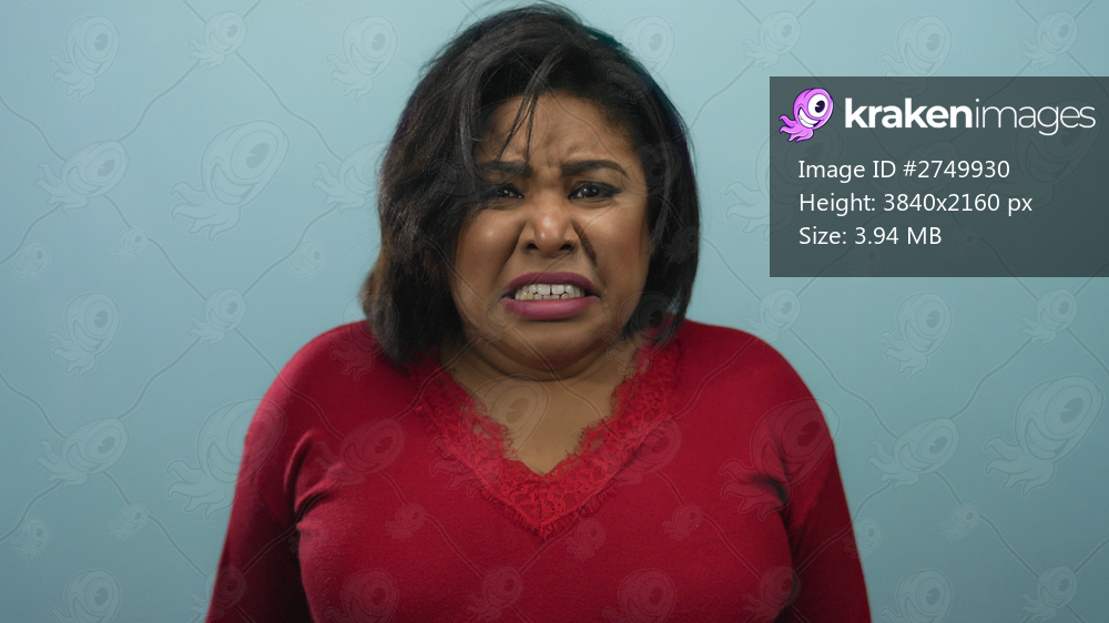 Woman expressing emotion against blue wall wearing red shirt with lace detail displaying a mix of anger and frustration captured in a studio setting.