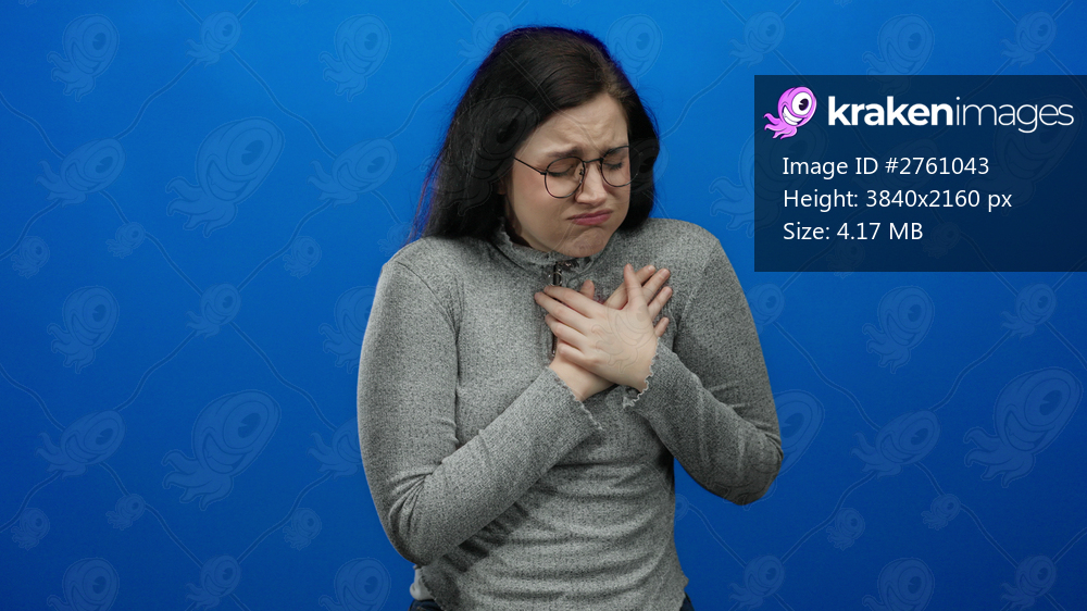 Woman expressing emotion with hands on chest against blue background in studio setting, wearing grey sweater and glasses, showcasing sincere and heartfelt emotions. - Kraken Images