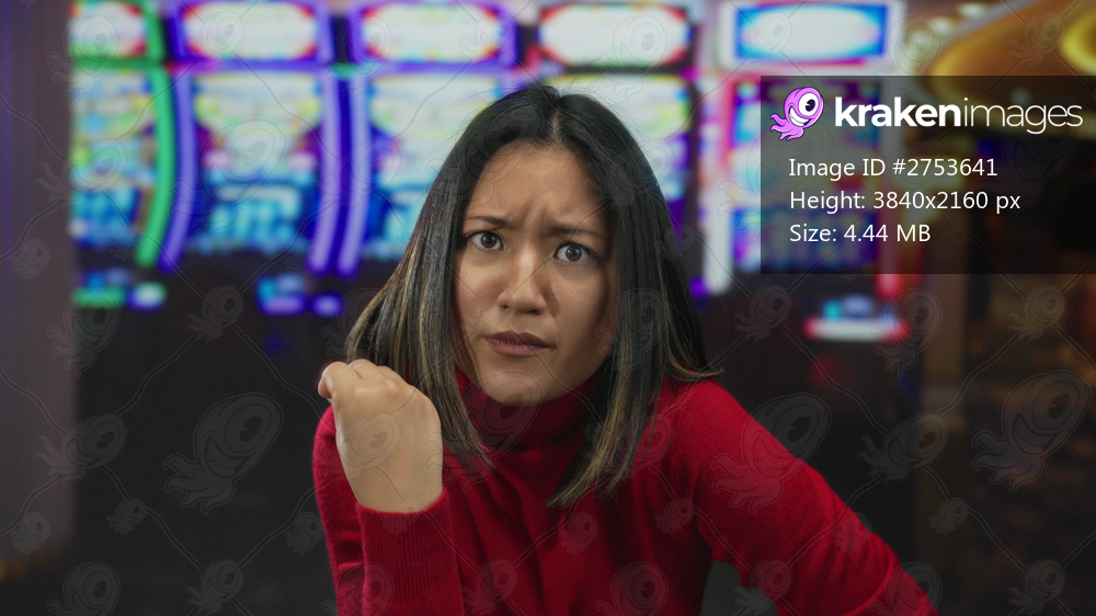 Woman expressing emotion in a lively casino setting with vibrant slot machines in the background, conveying excitement and tension indoors.