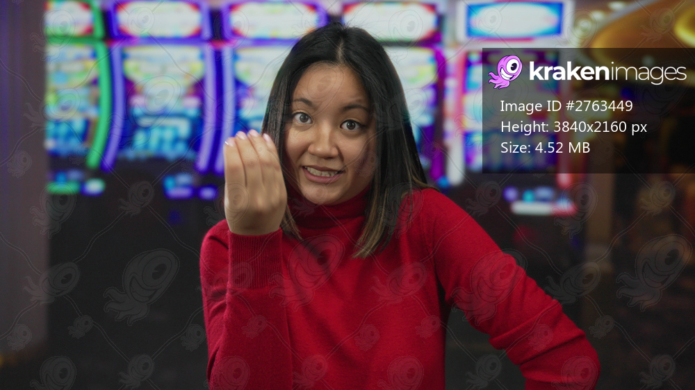 Woman expressing emotion in a lively casino setting with vibrant slot machines in the background, conveying excitement and tension indoors.