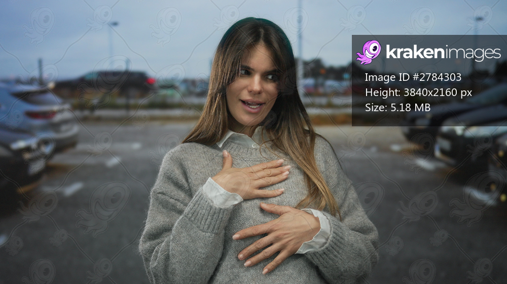 Woman expressing emotion in outdoor parking with cars in the background, showing gesture with hands on chest, wearing casual attire and appearing surprised or amused. - Kraken Images