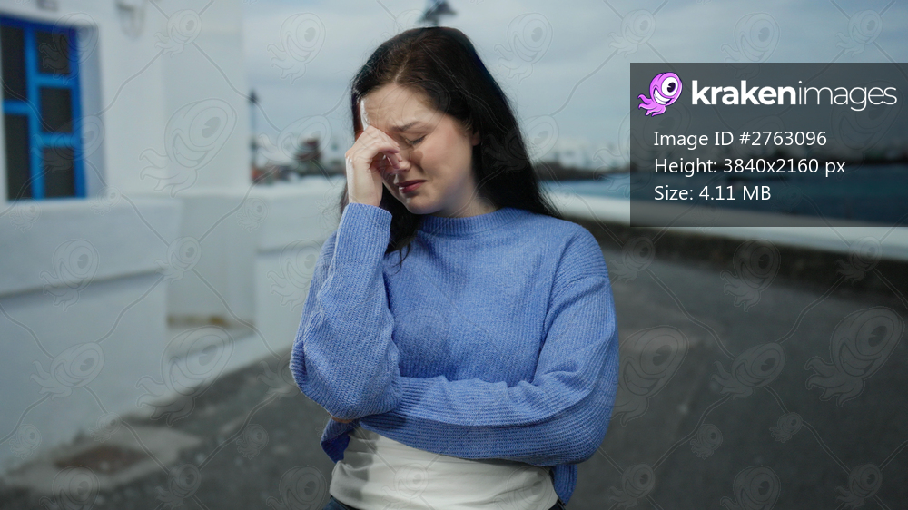 Woman expressing emotion on beach promenade wearing blue sweater, capturing intense feelings, brunette hair, embracing self in seaside urban environment, serene yet emotional scene