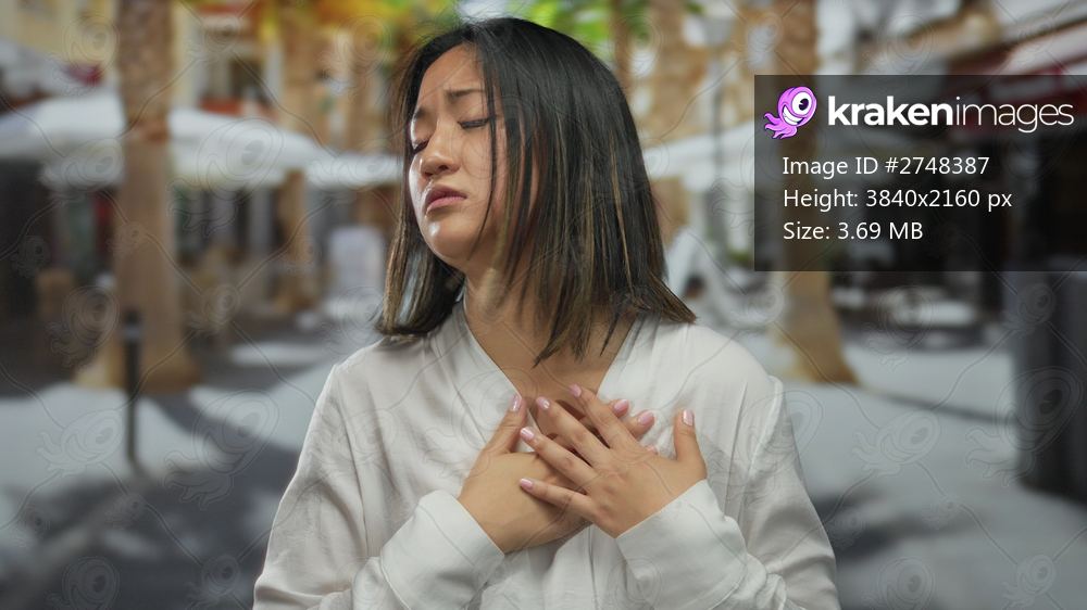 Woman expressing emotion on city street outdoors wearing white shirt looking contemplative with blurred urban background