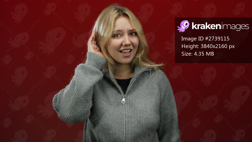 Woman expressing emotions against bold red background with blonde hair in a gray sweater.