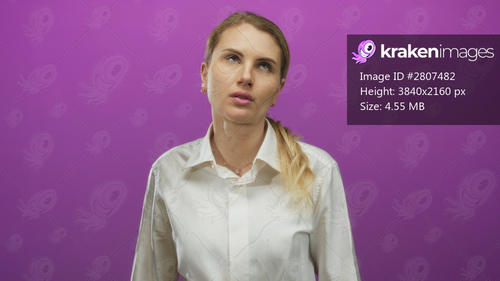 Woman expressing emotions in front of a vibrant purple background, wearing a white shirt and displaying various facial expressions with blonde hair, caucasian appearance, and isolated setting. - Kraken Images