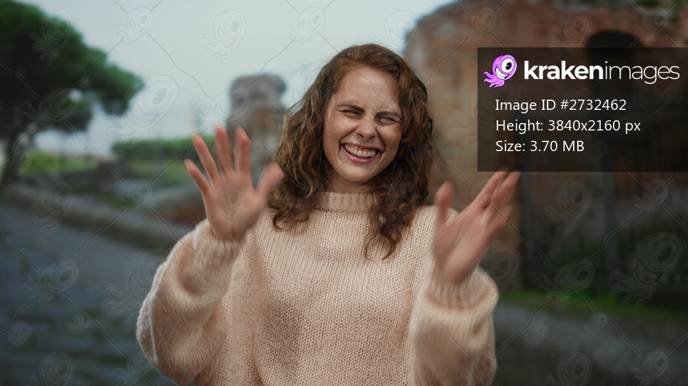 Woman expressing emotions on a city street with ancient stone walls, surrounded by outdoor cityscape, charmingly dressed in a cozy sweater.
