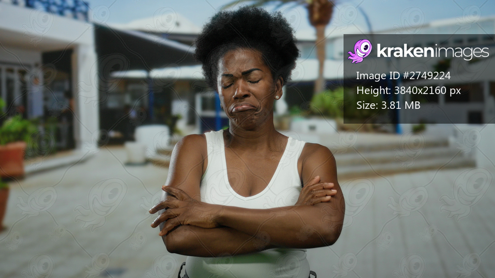 Woman expressing emotions on a street, wearing a white shirt, exhibiting a pensive mood with arms crossed in an urban outdoor setting, showcasing an american city backdrop. - Kraken Images