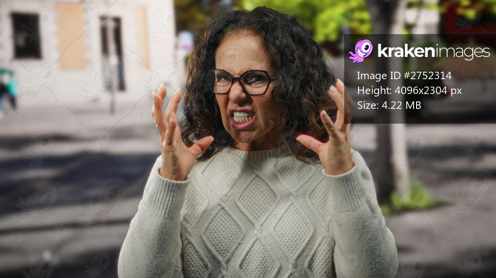 Woman expressing emotions on city street with curly hair, wearing sweater and glasses, portraying frustration in urban outdoor setting with blurred background. - Kraken Images
