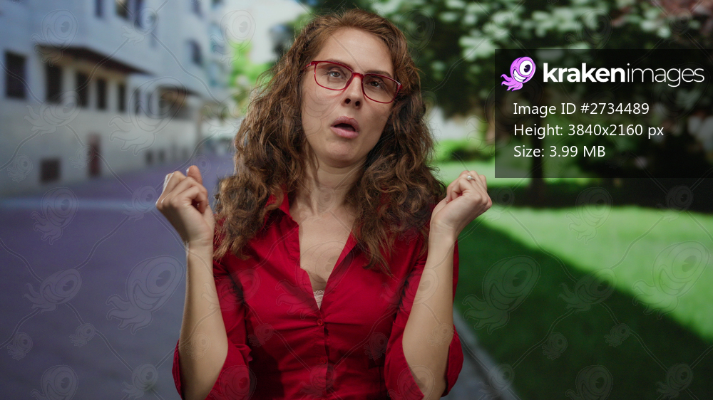 Woman expressing emotions on city street with trees in background wearing red shirt and glasses outdoor in urban area with humor and surprise.
