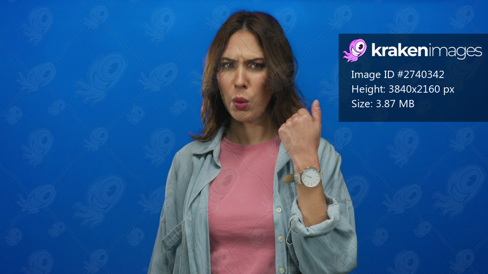 Woman expressing emotions over isolated blue background wearing casual pink shirt and denim jacket with a thoughtful gesture and hand on her mouth.