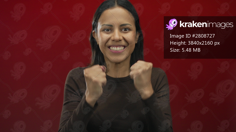 Woman expressing excitement with clenched fists over an isolated red background, showcasing vibrant emotions and energy.